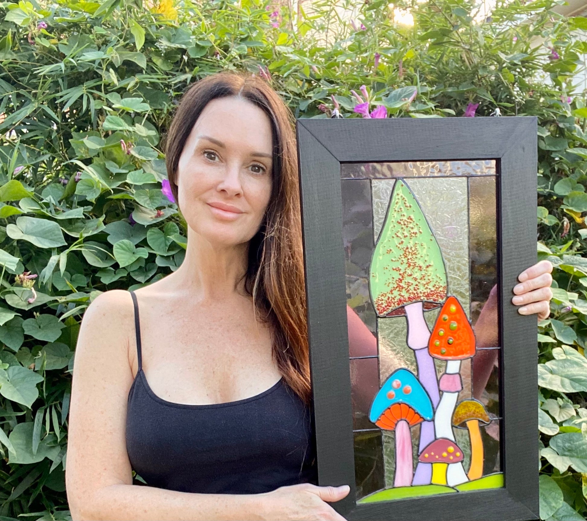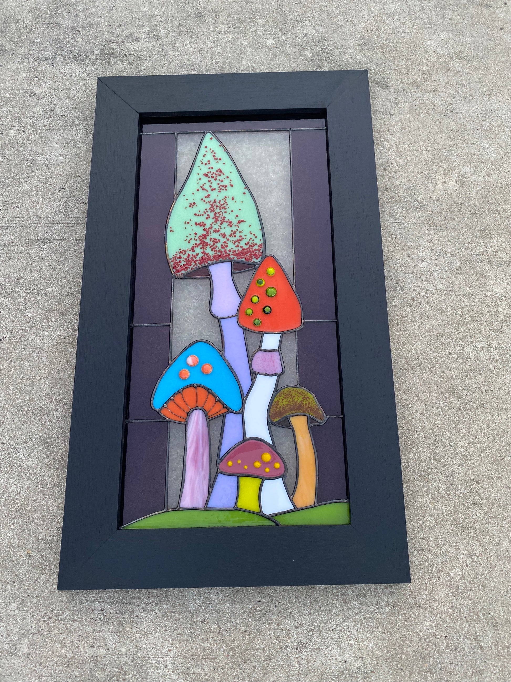 What it is: A magical brightly colored mushroom fused stained glass window panel ~~ framed in a custom made wooden frame, painted black